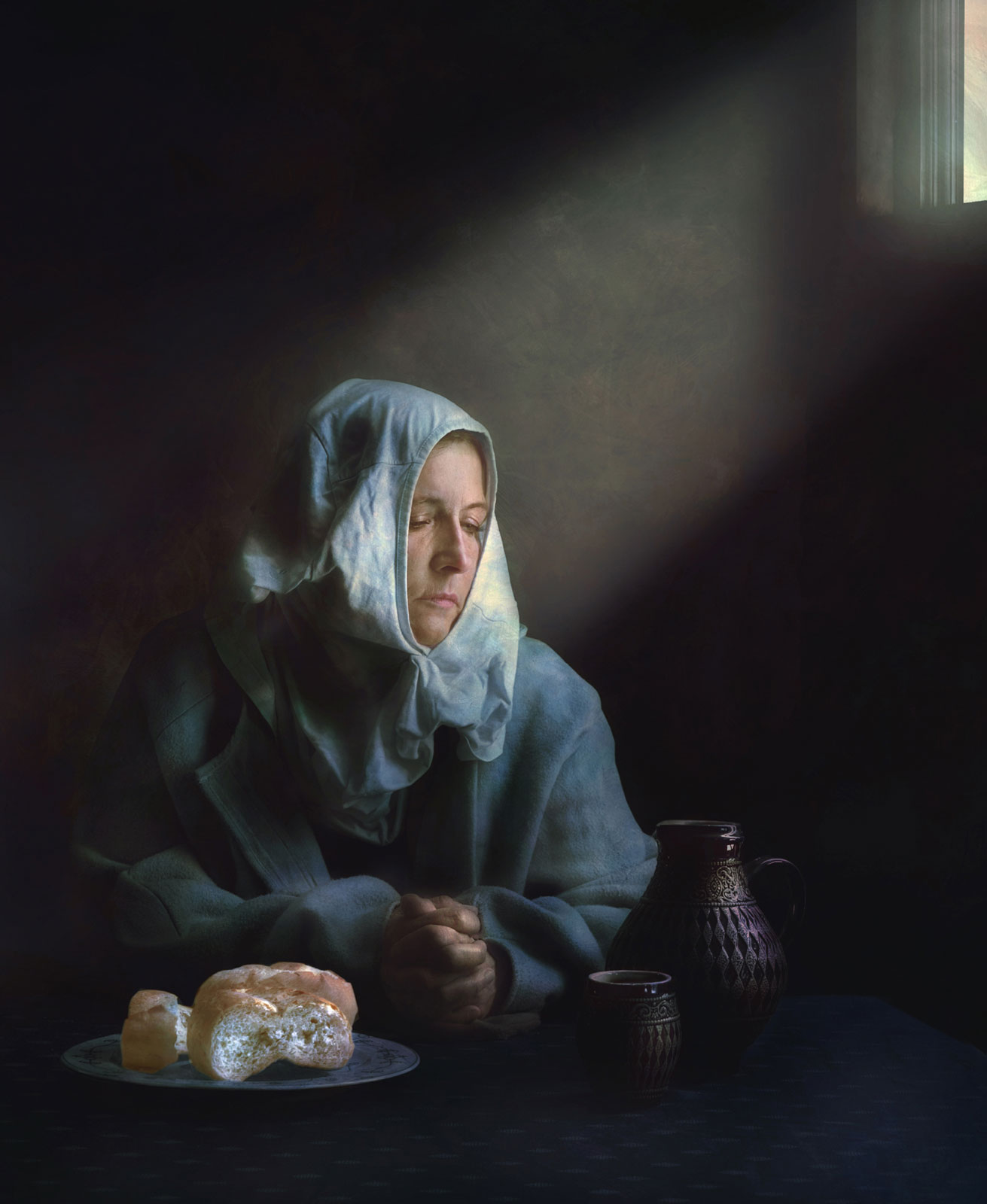 Die Fotografie zeigt das Bildnis einer Frau in einem barockhaften Licht. Sie sitzt am Tisch mit einer Karaffe und einem Trinkgefäß.