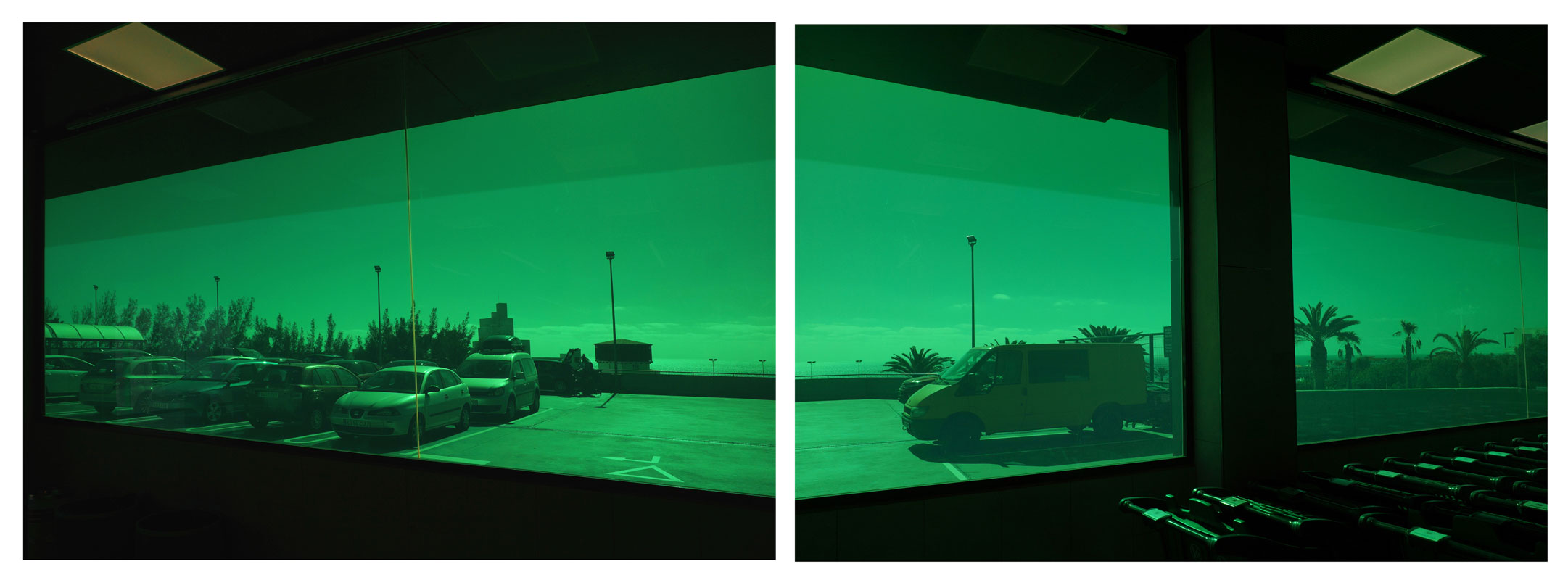Fotografischer Ausblick durch eine grüne Panoramascheibe auf einen Parkplatz. Im Hintergrund, der Meereshorizont.